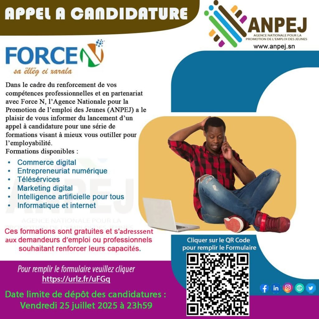 Dans le cadre du renforcement de vos compétences professionnelles et en partenariat avec Force N, l’Agence Nationale pour la Promotion de l’emploi des Jeunes (ANPEJ) a le plaisir de vous informer du lancement d’un appel à candidature pour une série de modules de formation visant à mieux vous outiller pour le marché de l’emploi et l’auto-emploi.