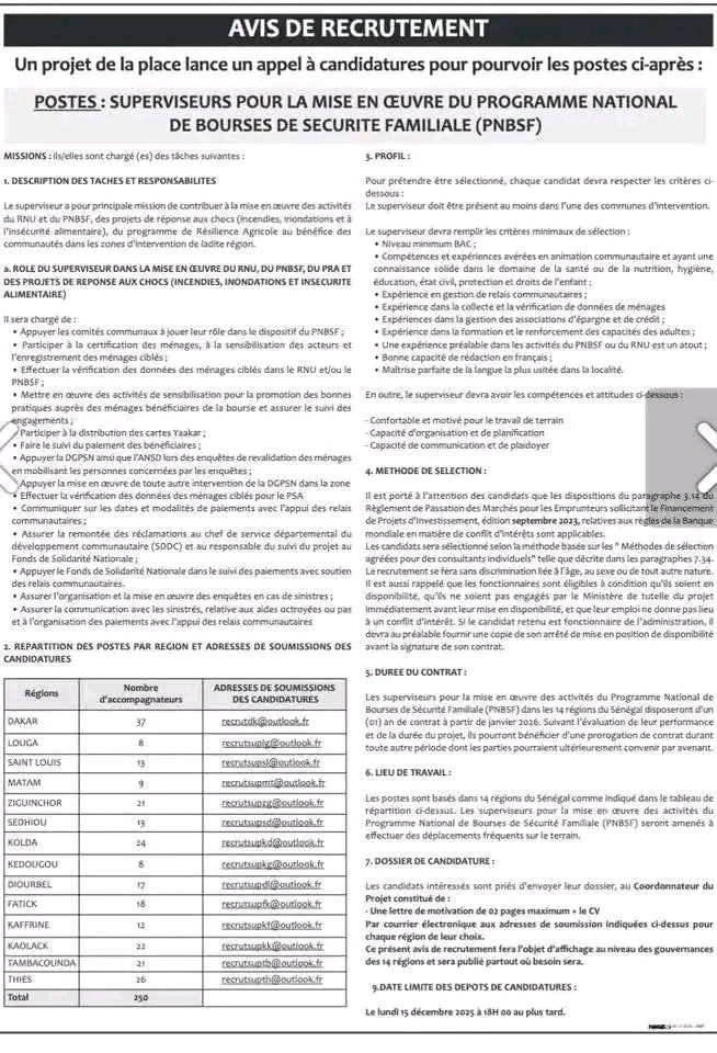 Appel à candidatures pour 250 Superviseurs au programme nationale de bourses de securite familiale
