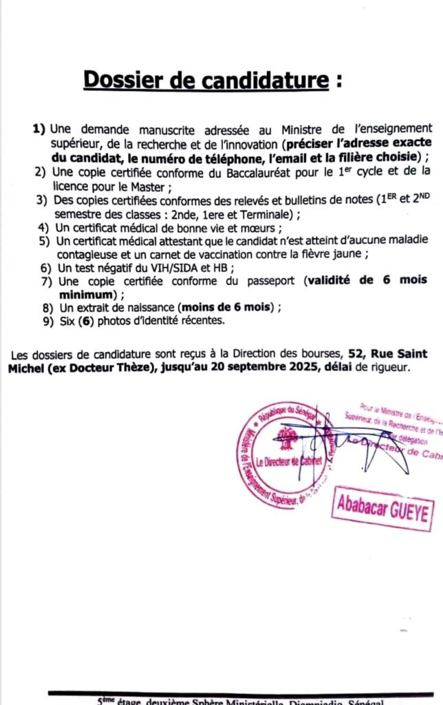 Le Gouvernement du Sultanat d’Oman offre au Gouvernement de la République du Sénégal une bourse d’études dans les filières scientifiques en licence et en Master au titre de l’année académique 2025-2026.