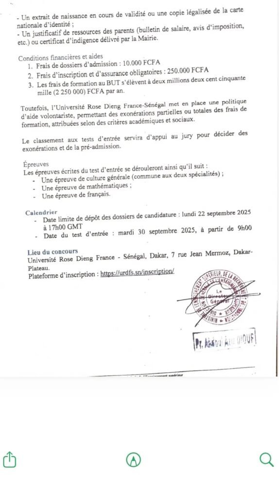 Le Ministère de l’Enseignement supérieur de la Recherche et de l’Innovation porte à la connaissance des bachelières et bacheliers que le test d’entrée pour l’admission à l’Université Rose Dieng France-Sénégal, au titre de l’année 2025-2026, est ouvert .